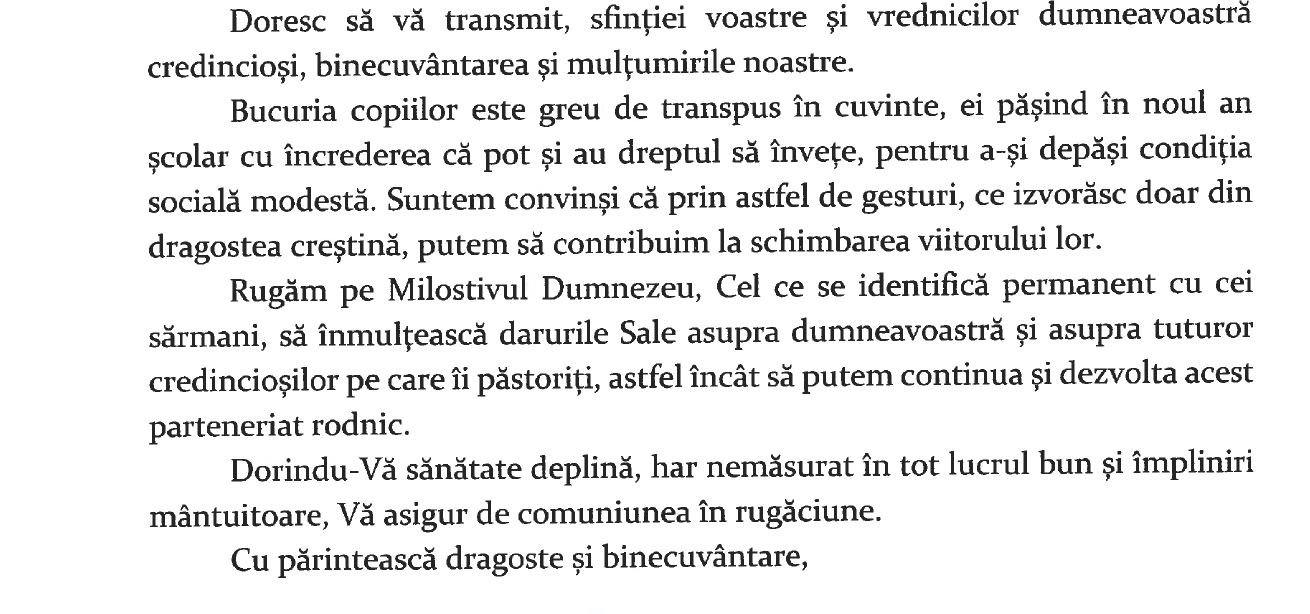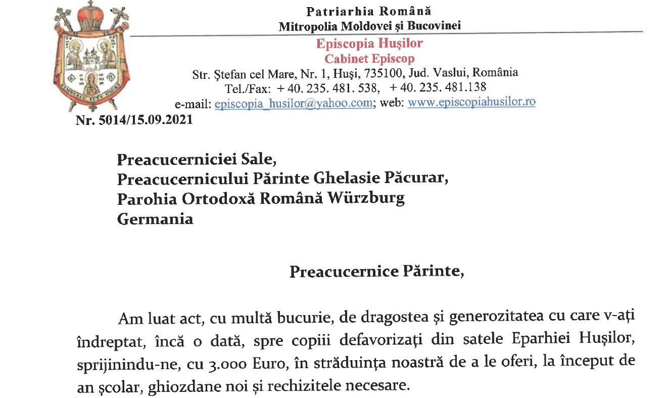 Scrisoarea de multumire a Preasfinţitului Părinte Ignatie, Episcopul Hușilor: